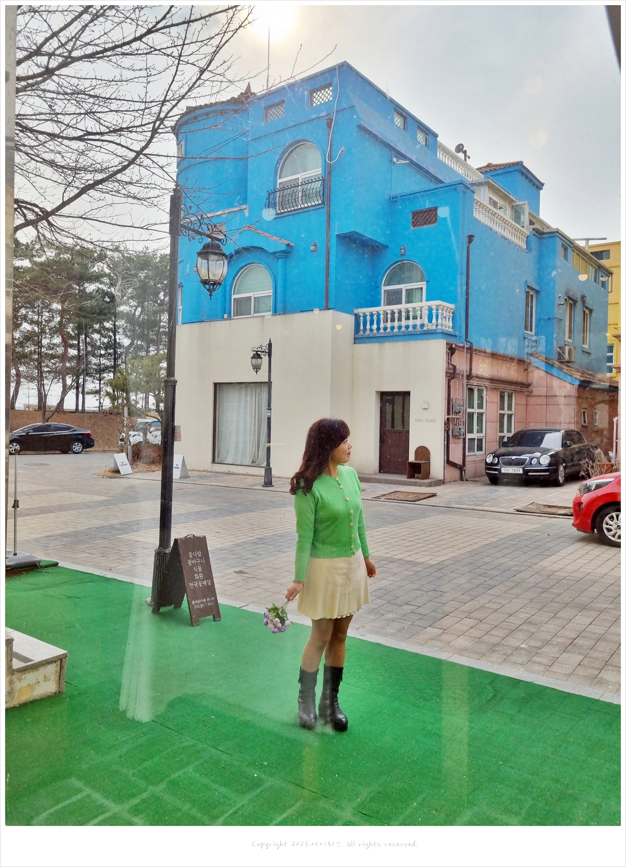 장미꽃 들고 밖으로 나가 찰칵~