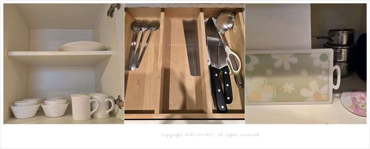 싱크대 서랍에는 접시, 그릇, 물컵