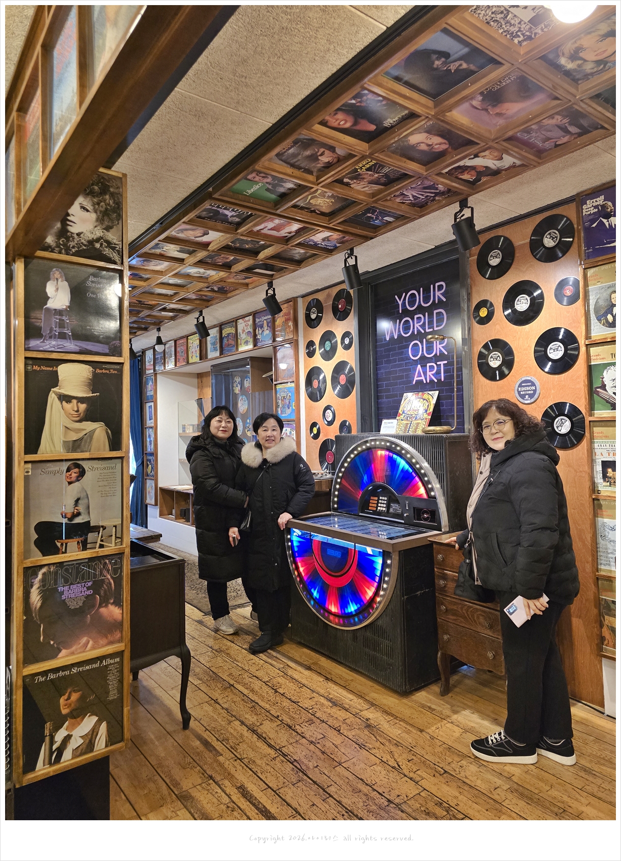 비틀즈 앨범으로 꾸며진 공간을 보고 있는 친구들